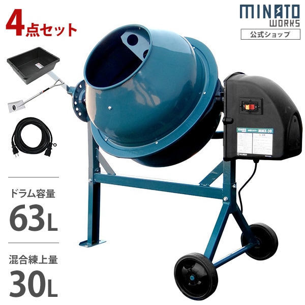 ミナト 電動コンクリートミキサー 1.25切 MMX-30 《スコップ・プラ船・延長コード付4点セット》 (100Vモーター付)