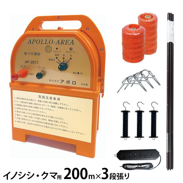 アポロ 電気柵 エリアシステム AP-2011 FRP支柱仕様 イノシシ・クマ用 200m×3段張りセット