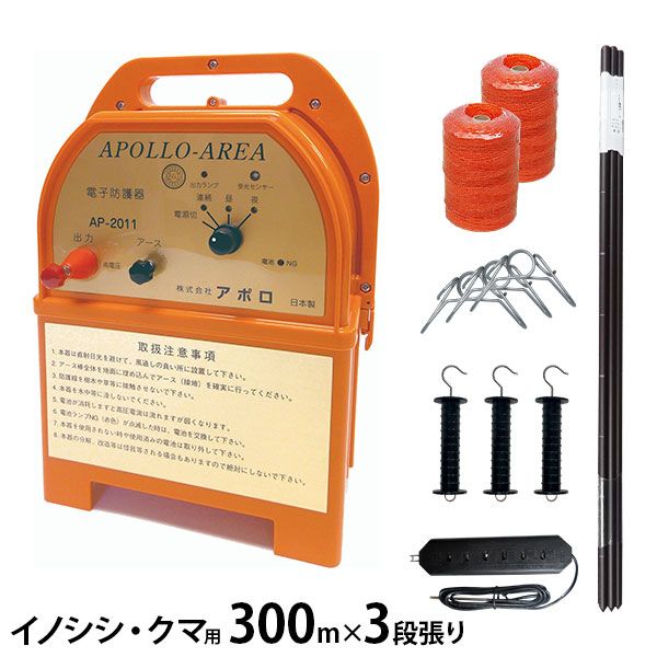 アポロ 電気柵 エリアシステム AP-2011 FRP支柱仕様 イノシシ・クマ用 300m×3段張りセット