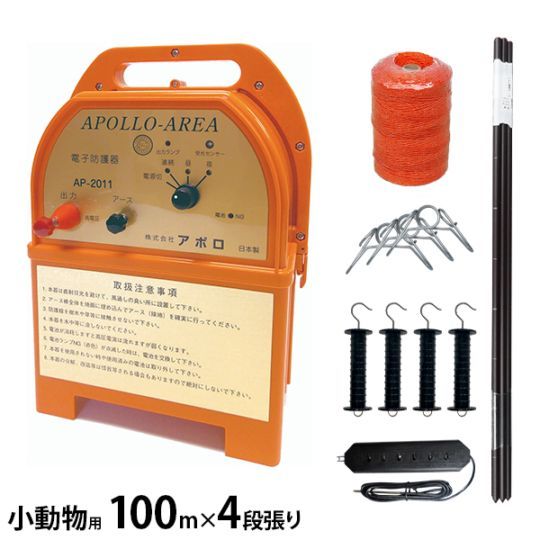 アポロ 電気柵 エリアシステム AP-2011 FRP支柱仕様 小動物用 (ハクビシン・アライグマ・タヌキ) 100m×4段張りセット