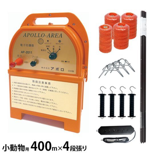 アポロ 電気柵 エリアシステム AP-2011 FRP支柱仕様 小動物用 (ハクビシン・アライグマ・タヌキ) 400m×4段張りセット